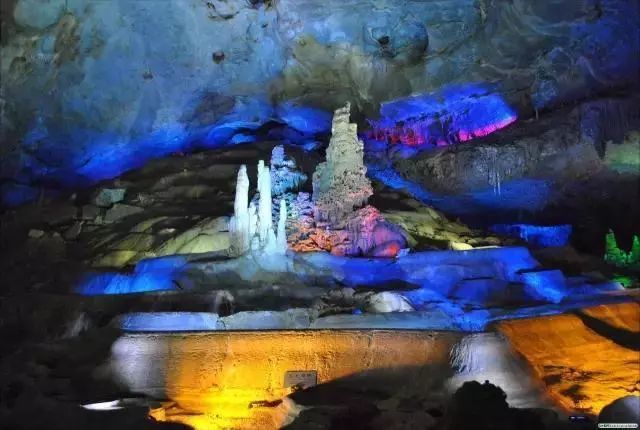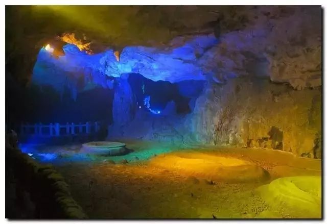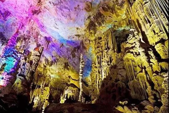 溶洞内是瑰丽多姿的钟乳石景,通过彩灯的折射,钟乳石形态各异。