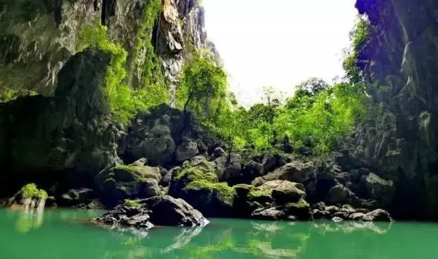 乘坐小船渐渐驶出或明或暗的溶洞,出了洞口重见天日,颇有“豁然开朗”之感。