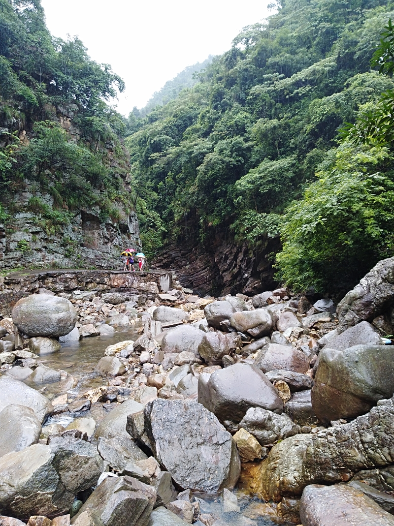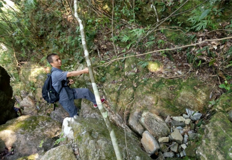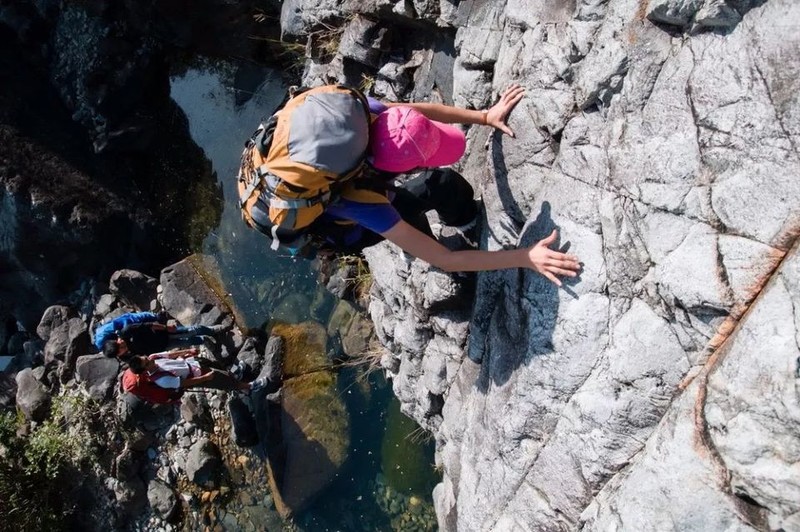 徒步线路上,时而可见同膝盖高或比膝盖略高的台阶地,或是斜坡上露出很大的高度落差坡度等。下行这种落差很高的台阶地形时,严禁突然往下弹跳,切记切记!!!跳着下,不仅会滑倒、扭伤脚踝、还会有挫伤或骨折的危险性。