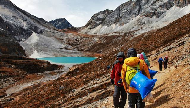 面对一些女孩子或体力较弱的队员,有些领队往往帮他们背东西,甚至背包,这是万万不可取的。既然出来,每个人都要有独立面对困难的勇气,当体力不行时,体力好的可以适当分担一些重量,但是必须保证该队员最低生活标准,一些食物和睡袋是必须的,因为当出现意外情况失散时,这些是等待救援的最后依靠。