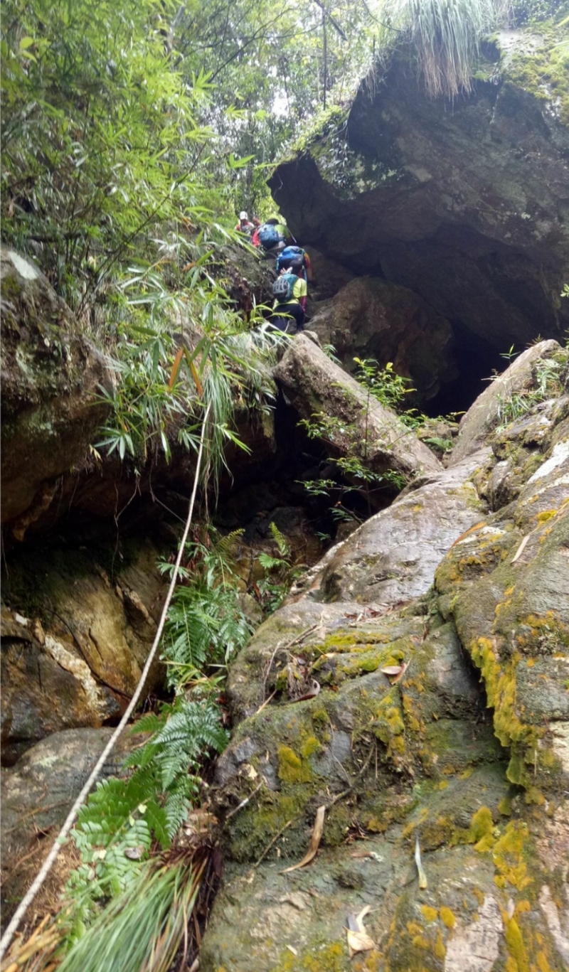正确的下行步法是利用边上树根类的植物紧紧抓住,稳住身体重心把脚顺利往下掂着地,或者坐在地上慢慢滑下去着地。