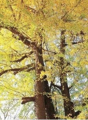 大大小小金灿灿的银杏树就在风中摇曳,偶或也可遇上一棵千年古老银杏在小山岗上矗立,高大的冠盖在秋日阳光下金黄诱人,姿态婆娑直冲云霄。微风拂过,满树的黄叶如同蝶影舞动飘飘洒洒坠落,瓦顶、墙头、地面一片金黄。俯拾黄叶一片,场面的既视感恍如隔世,但愿时光尽为此刻而停留。
