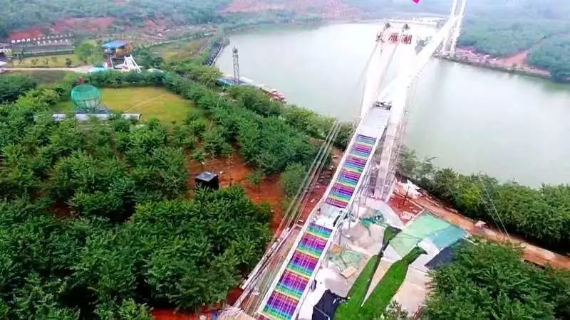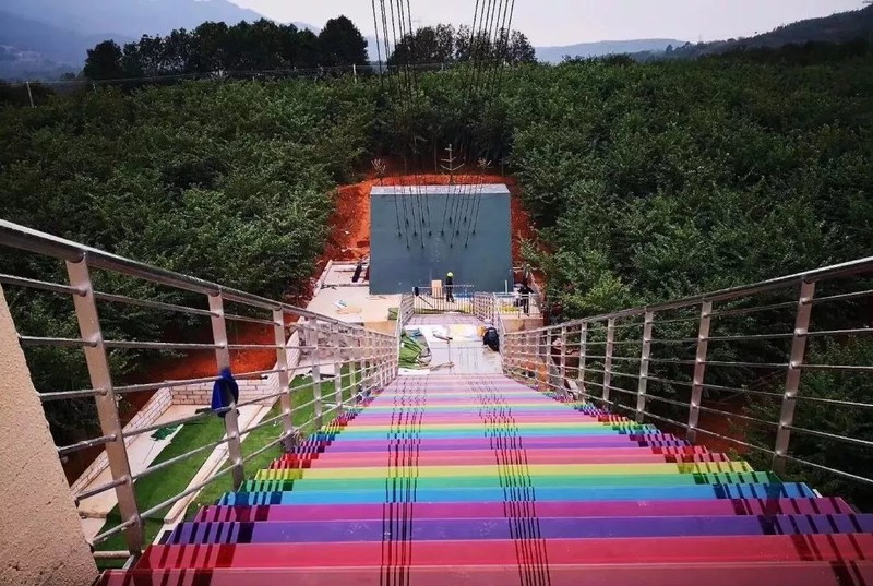 目前工人们正在进行上桥步梯的铺设,步梯的玻璃采用了彩色透明玻璃,而且将会加上灯光,夜幕降临时将如同走在彩虹上一般。