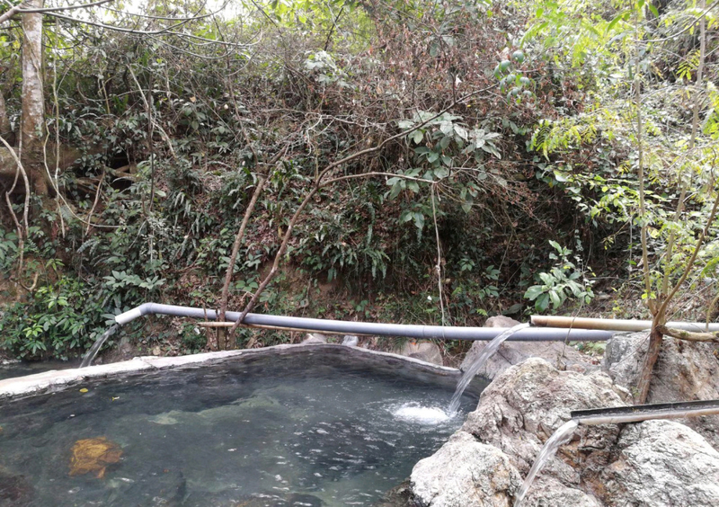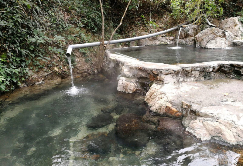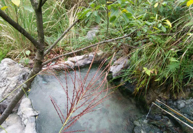 当然既然说了是山野温泉,设施肯定是较简单和质朴。在这里看守的是当地的几个果农,他们或苦于资金等因素,只是依山势及温泉水出水口,简单的用石块修建了几个小池子,池边还是原生态的各种树木和杂草,而导水的水管也是就地采材,用山上的毛竹架接的…或许,正是这种质朴,让置身其中的人们有种返朴归真,完全的融入大自然中的感受。