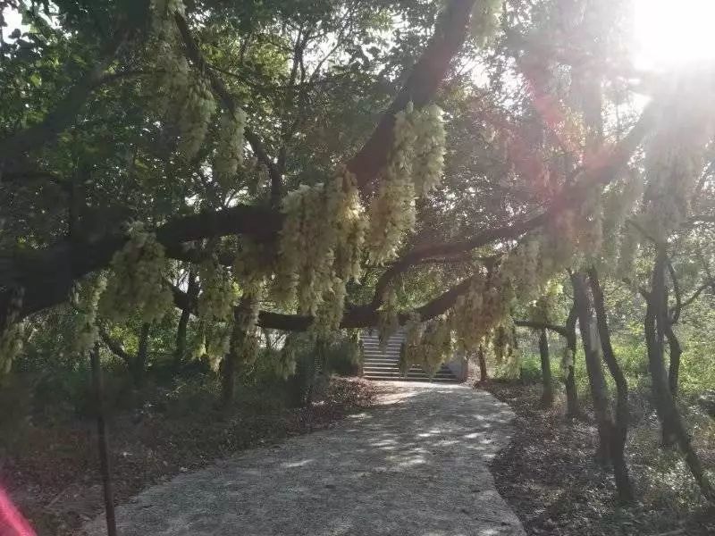 进入园区大门便可以见到禾雀花的攀爬、悬挂的姿态,无比壮观。满园的花朵都像栩栩如生的禾雀集群觅食一般,热闹不止。