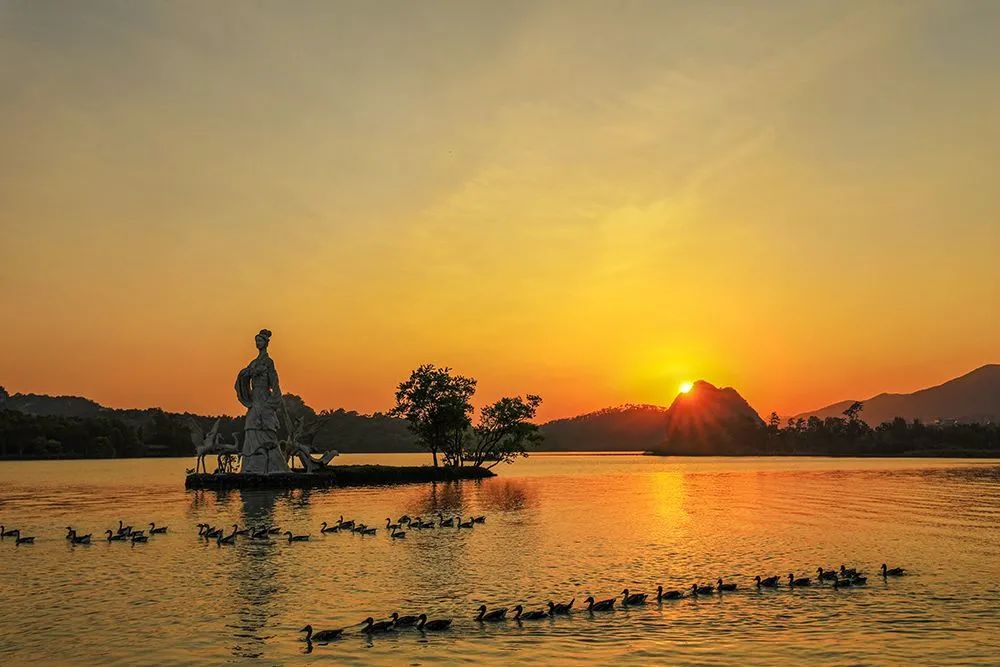 13:00 上车出发星湖湿地公园,坐船游参观路线:进入星湖仙女湖景区内到达码头坐船(约18分钟)—上岛参观火烈鸟~步行经九曲浮桥~到达丹顶鹤岛—再坐船约5分钟—到达灵芝岛码头登陆~步行参观鹊桥、出米洞、灵芝岛、金沙滩、观佛台、湿地科普馆及宣教中心等。注:坐船途中更可观赏:远眺天柱之摘星亭~北岭山之将军山~野生候鸟岛~禾花仙女像~天然卧佛~月亮桥(西游记取景点)—远观狮岗炮台~经野生候鸟岛~2888棵水杉群等,丹顶鹤50多只和宫廷美女火烈鸟120多只。