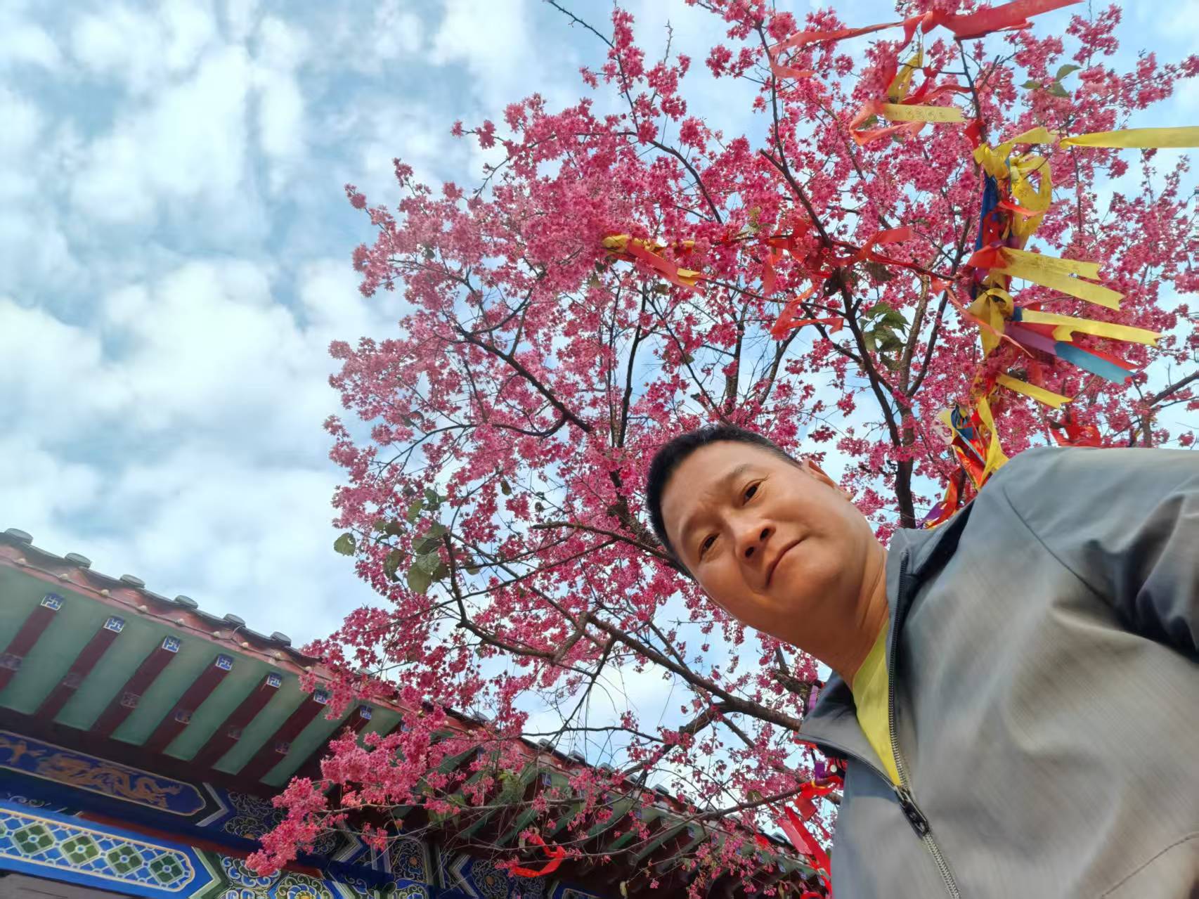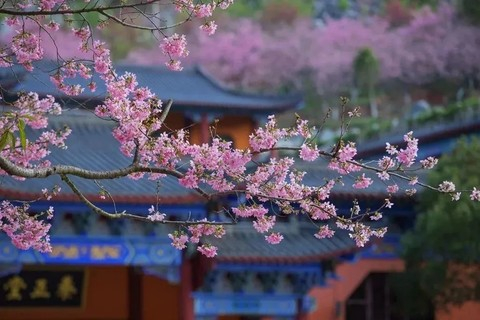 寺内的樱花盛开,一簇又一簇,娇嫩柔美地俏立在枝头,空气中随处弥漫着清新的花香,那压弯枝头的樱花与这黄墙黛瓦相映衬,此景美不胜收。