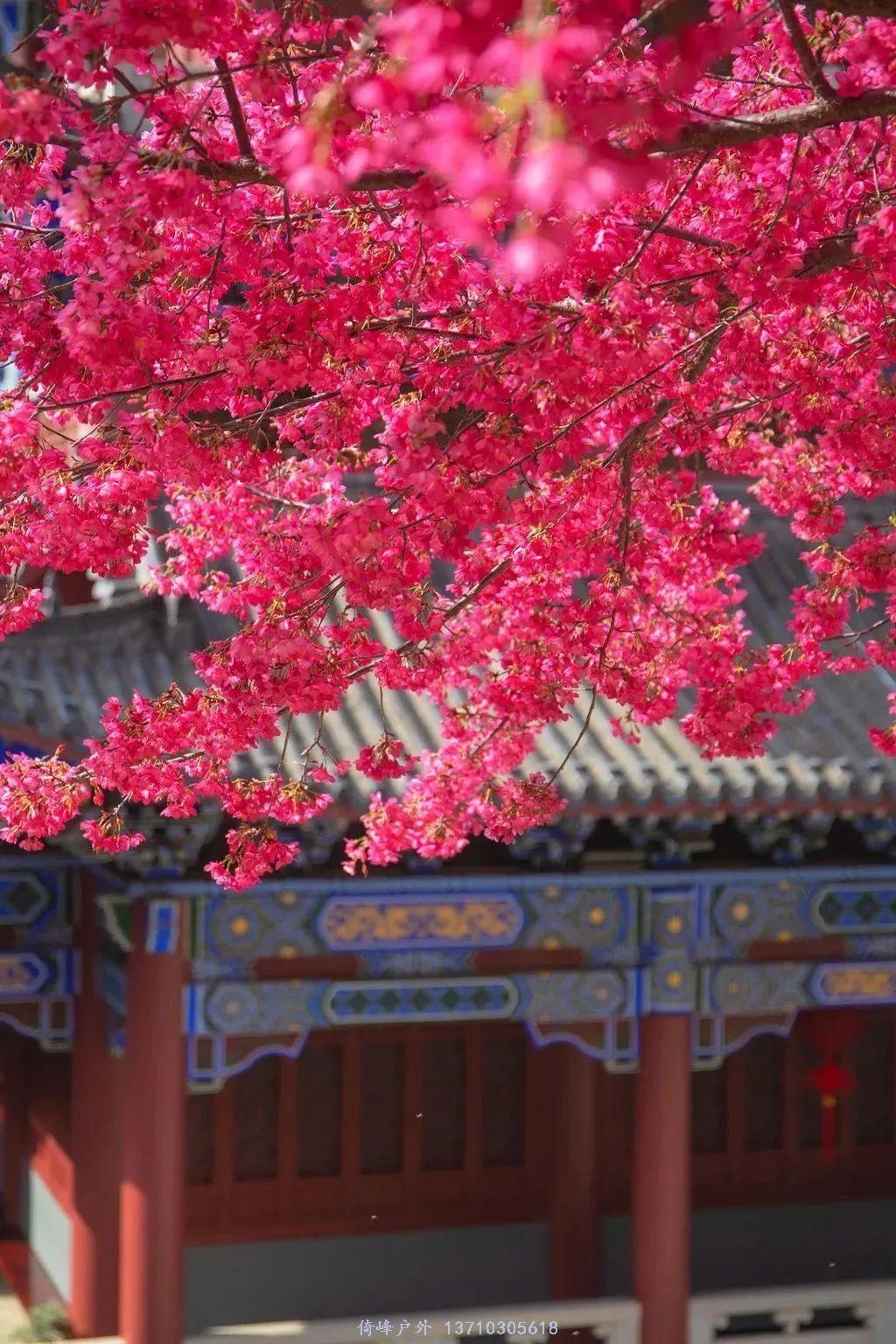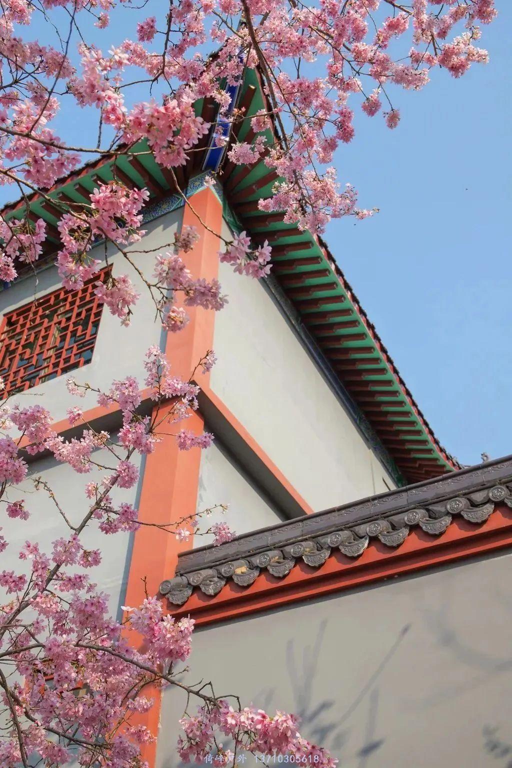 樱花丛中的殿堂、黄色的院墙、青灰色的殿脊、全都沐浴明媚的日光中,更显古朴清雅。殿阁嵯峨,檐枋彩画,盛放的樱花与古刹的梵音作伴,相映生辉。