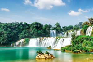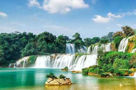 德天瀑布的美在于瀑布分三级,层层跌宕,午间艳阳高照,百米来宽的断崖上巨瀑如海倾,黄昏时夕阳残照,美不胜收,暮色中的瀑布如银帘高挂,似缟绢垂天,引人遐想。